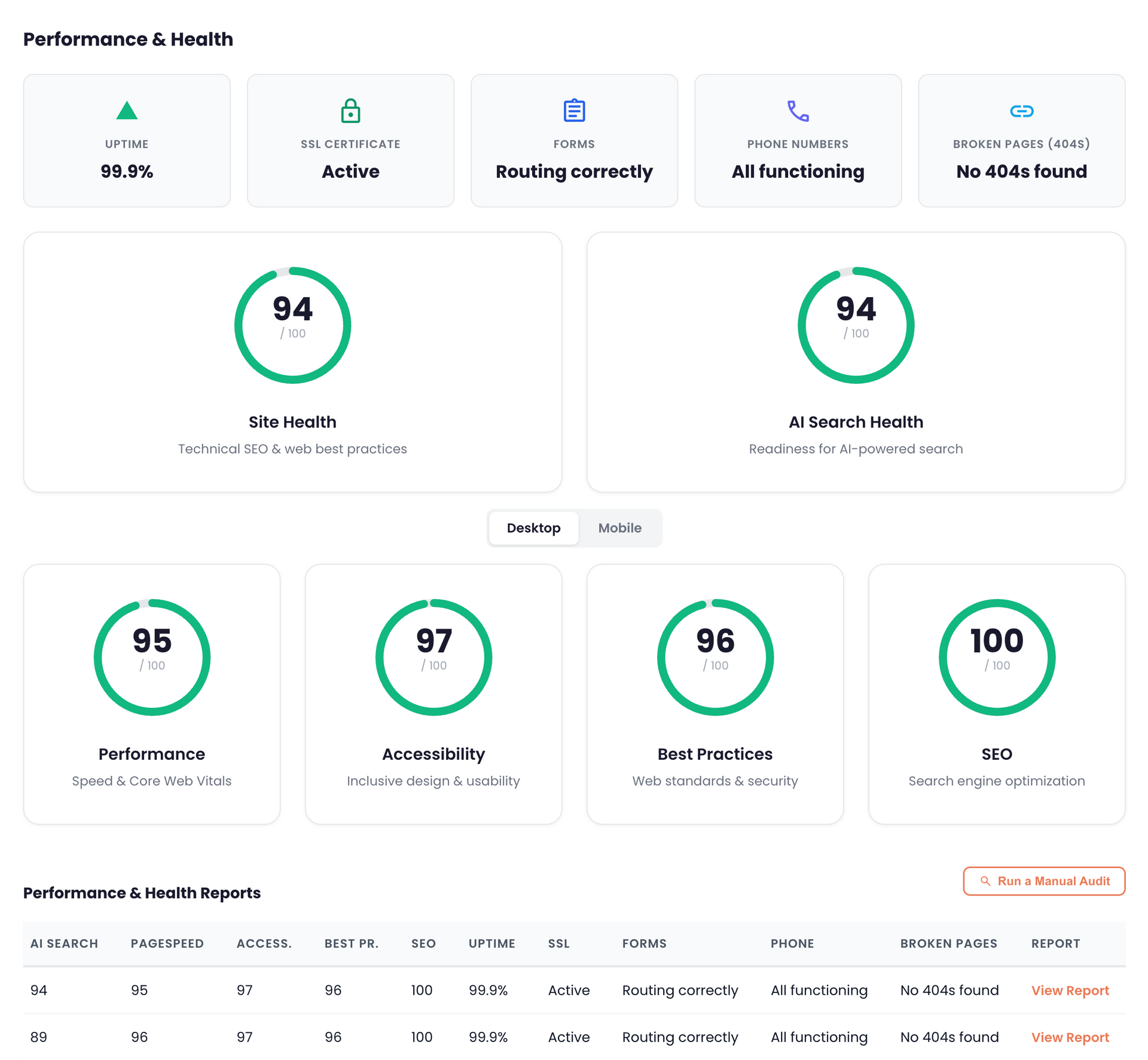 We monitor your site's uptime, SSL security, form routing, phone links, and broken pages so issues are caught before they ever reach your customers. As well as every month, we score your site against Google's Lighthouse benchmarks (Performance, Accessibility, Best Practices, and SEO) along with a comprehensive Site Health audit & AI Search Readiness check, giving you a clear, data-driven picture of exactly where you stand.