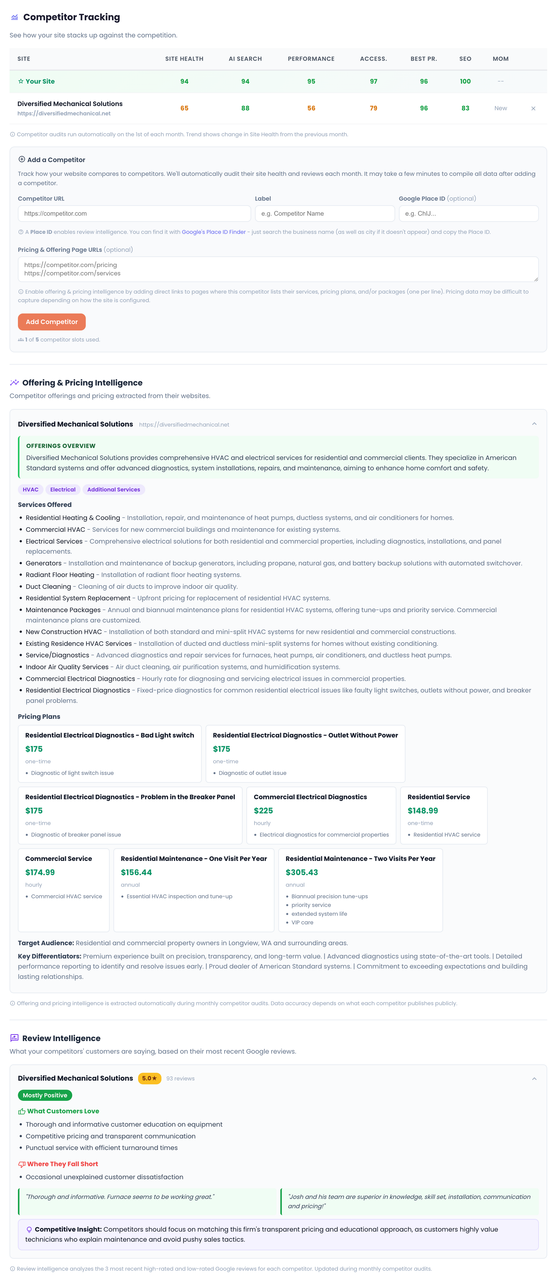 Keep a pulse on your competitors without having to do the research yourself. We automatically monitor your competitors for you, extracting their latest pricing/offering updates and site performance scores, so you can see exactly how you compare side-by-side. We even analyze their Google reviews to uncover their strengths & weaknesses and deliver ready-to-use competitive insights, so you can strategize accordingly.